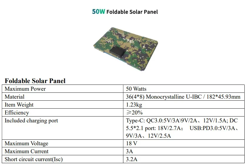 - Комплектная солнечная панель: сложная, мощность 50 Вт, КПД не менее 20%, максимальное напряжение 18 В, максимальный ток 3 А, порты USB PD3.0, Type-C QC3.0 и DC 5.5×2.1